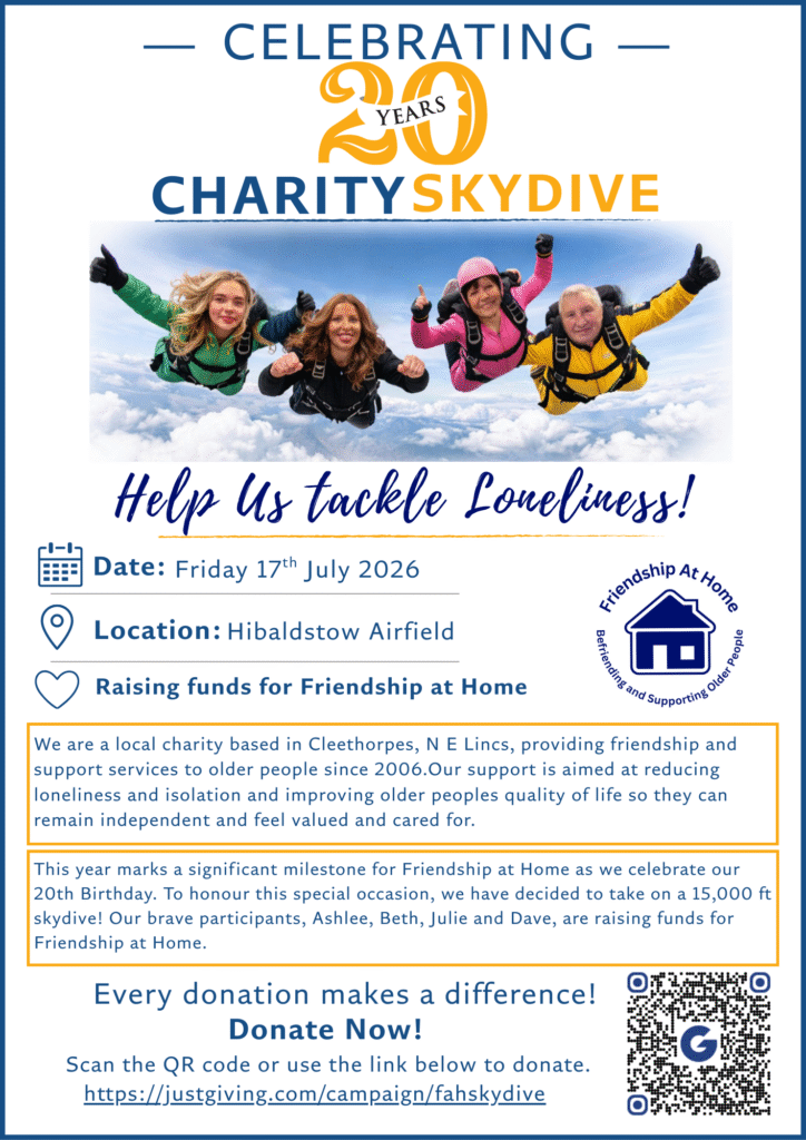 This year marks a significant milestone for Friendship at Home as we celebrate our 20th Birthday. To honour this special occasion, we have decided to take on a 15,000 ft skydive! Our brave participants, Ashlee, Beth, Julie and Dave, are raising funds for Friendship at Home. On Friday 17th July 2026, we will be celebrating at Hibaldstow Airfield for a Skydive.